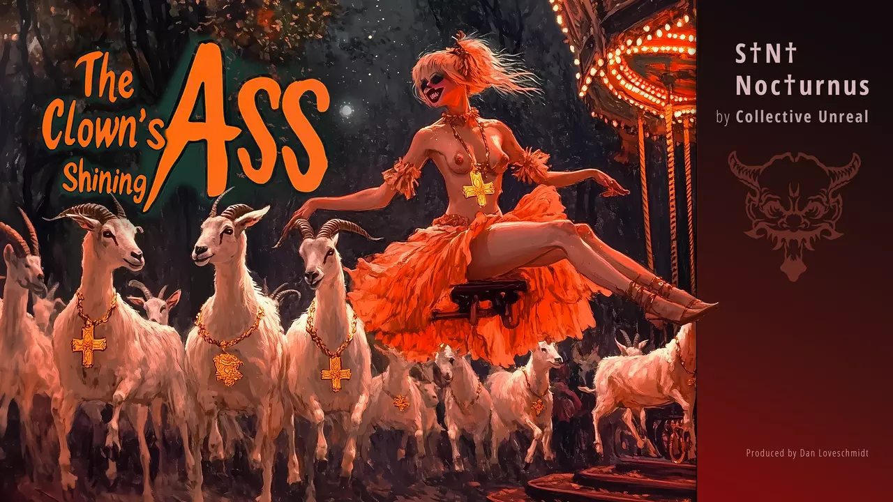 (Chorus) Round and round, the march goes on, Clowns and goats, the path is gone. No star above, just a glow from below, The ass shines bright, its long ears show. The donkey shines with a lantern low, Hung from its tail, a foolish glow. The clown rides high, his grin grotesque, A jester’s hat on his bright red jest. They march with gifts for the king they claim, But the path loops back, always the same. (Chorus) Round and round, the march goes on, Clowns and goats, the path is gone. No star above, just a glow from below, The ass shines bright, its long ears show. The goats are draped in ribbons and bells, Their horns adorned like darkened shells. The clown plays tunes on a squeaky toy, A shrill refrain of hollow joy. Their boxes rattle, but inside is ash, A mockery wrapped in a golden stash. The fools still follow, their eyes on the clown, With dreams of the king and a prophet’s crown. The gifts they bear rot as they spin, Their faith a shell, hollow within. The donkey brays, its lantern sways, Marking their endless, empty days. (Chorus) Round and round, the march goes on, Clowns and goats, the path is gone. No star above, just a glow from below, The ass shines bright, its long ears show. The path ahead is a painted lie, A carousel march beneath the sky. The squeaky tune drones ever near, A song of cheer on top of fear. No end awaits, no king is there, Just the glow of the ass in the shiny old fair. (Outro) Round and round, the story fades, The lantern dims, but the jest remains. The clown still laughs, the goats still tread, As the fools all march for a king long dead. (Narrator) And so they marched, Through fields of ash and dreams long gone, The clown’s glow their beacon, A false light on a road that led nowhere. The lantern swung, casting shadows of fools, Each step repeating, each gift unwrapped, Revealing nothing but emptiness. The goats, blind-eyed, trudged in endless circles, Their bells chiming a hollow hymn to the king Who never waited, who never called. The squeak of the clown’s toy lingered, A dirge disguised as a melody, Pulling the faithful onward, Closer to nowhere, Forever. (Outro) Round and round, the story fades, The lantern dims, but the jest remains. The clown still laughs, the goats still tread, As the fools all march for a king long dead.