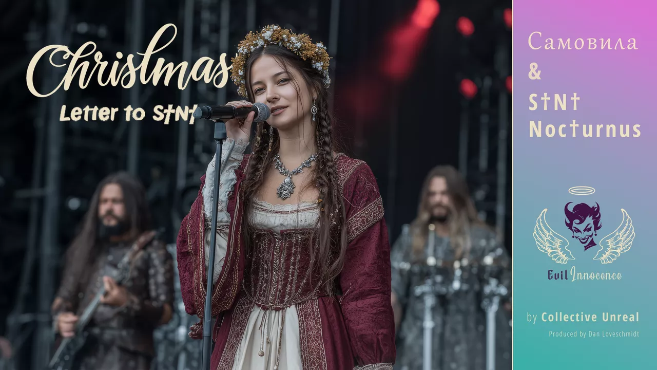 Stay a while and listen to Samovilla and S†N† Noc†urnus performing together in their collaborative project "Evil Innocence", S†N† being the evil and Samovilla coming as the innocent one. Samovilla's love for what's pagan and rooted in Balkan mythology meets S†N†'s Satanic and blasphemous narrative birthing a rather cute mutant cover to S†N†'s "Christmas Letter to STNT". Playful Balkan rhythms and native instruments replace the traditional rock drums and electric guitar usually accompanying S†N†'s vocals, combining with Samovilla's sensual and yet powerful voice.